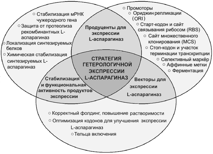 L-аспарагиназa (КФ 3.5.1.1.) — фермент с самым высоким уровнем мирового производства, используемый при лечении онкологических заболеваний, а также в пищевой промышленности. Для производства многих целевых белков используются различные системы экспрессии – от бесклеточных до гиперпродуктивных клеток растений, насекомых, бактерий и млекопитающих. В данном обзоре предпринята попытка обобщить общирные данные по экспрессии гетерологичных генов и технологии производства рекомбинантных L-аспарагиназ.