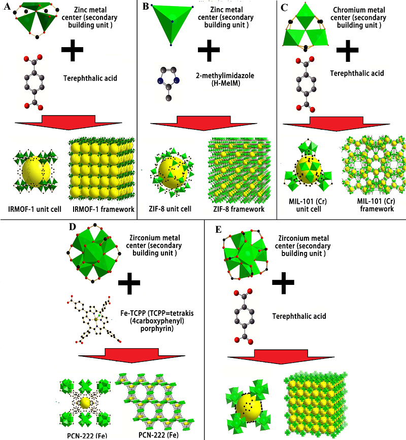 Композиты на основе MOK и COF, обозначаемые как MOK + COF, синтезируют методом постсинтетической модификации. Этот подход включает диспергирование наночастиц MOК на поверхности листов COF и позволяет формировать композитные структуры с улучшенными характеристиками по сравнению с исходными компонентами. Предварительная спроектированная структура COF позволяет проводить постсинтетические модификации для придания новых свойств и функций синтезированных материалов. В гетероструктурах, таких как COF-в-MOК, MOК используется в качестве шаблона для роста COF внутри его пор, что позволяет создавать материалы с контролируемыми свойствами и высокой степенью упорядоченности [203, 335]. Гибридные гетероструктуры MOК–COF с ковалентными связями оказались эффективными фотокатализаторами. Для создания гибридных материалов MOК–COF с ковалентными связями обычно использовали реакцию образования оснований Шиффа, в которой MOК содержали NH2–группы в структуре лиганда. Новая стратегия создания гибридных материалов MOК–COF с ковалентными связями включала проведение постсинтетической модификации металлических узлов MOК, лигандами, не содержащие NH2-группы. Затем Zr-MOК без NH2-лигандов (MOК-808), был модифицирован п-аминобензойной кислотой на кластерах Zr6 с целью введения NH2-групп. После чего был синтезирован гибридный комплекс MOК-808@TpPa-1-COF с ковалентной связью между двумя компонентами [204]. В этом контексте Peng и соавт.. [205] представили инновационную методологию синтеза нового типа материала — гибридного материала MOК@COF типа ядро–оболочка, как новый вид пористых материалов, обладающих уникальными свойствами (большая площадь поверхности, регулируемые структуры и большим разнообразием функциональных возможностей), которые привлекли большое внимание и развитие в области адсорбции газов, катализа, энергетики, экологии и биомедицины за последние десятилетия [206]. Путем интеграции металлорганических каркасов (MOК) и ковалентных органических каркасов (COF) синтезирован новый тип гибридного материала MOК@COF ядро-оболочка, содержащий NH2-аминогруппы в структуре МОК MIL-68@TPA(трис(4-формилфенил)амин)-COF, с высокой кристалличностью и иерархической структурой пор. Полученный гибридный материал NH2-MIL-68@TPA-COF использовался в качестве эффективного фотокатализатора, управляемого видимым светом, для деградации красителя родамина B. Важно отметить, что гипотетические наборы данных MOК и COF [207], состоящие из материалов, разработанных с помощью вычислений in silico, но не синтезированных экспериментально, также существуют и могут быть дополнительно исследованы для разработки гипотетических гибридов MOК/COF [206, 207]. Mультиферментные микрокапсулы (enzymes@COF), содержащие глюкозооксидазу (GOD), пероксидазу хрена (HRP) и ацетилхолинэстеразу (AChE), с полостью размером 600 нм и оболочкой из COF были использованы в электрохимических биосенсорах. Полость размером 600 нм обеспечивает свободное конформационное расширение инкапсулированных ферментов, а оболочка COF с хорошей химической стабильностью защищает инкапсулированные ферменты от внешних агрессивных сред. Мультиферментные микрокапсулы получали с использованием ZIF-8 в качестве «жертвенной» матрицы, покрывая их биосовместимой оболочкой COF. Сначала GOD, HRP и AChE были инкапсулированы в порах МОК ZIF-8 в виде стабильного комплекса ферменты@ZIF-8. После чего была сформиров