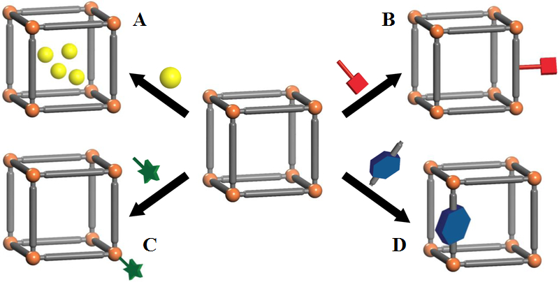 6.2. Методы включения биомолекул в структуру МОК/КТ Успех включения малых молекул или предшественников КТ в различных по размеру пор MOК непосредственно связан с получением желаемой структуры МОК. При этом способе используются различные методы для введения предшественников КТ в MOК, такие как осаждение из паровой фазы, инфильтрация раствора и измельчение в твердом состоянии. Однако отметим, что точно контролировать местоположение, состав, структуру и морфологию включенных молекул, часто вызывает определенные сложности. Одним из основных методов синтеза МОК/КТ является подход, получивший название «корабль–бутылка», который включает иммобилизацию малых молекул или прекурсоров КТ в порах MOК с последующей дальнейшей обработкой для достижения желаемой структуры. Для введения прекурсоров КТ в MOК были использованы различные методологии, такие как, осаждение из паровой фазы, инфильтрация раствора и твердотельное измельчение. Несмотря на некоторые недостатки значительным преимуществом технологии «корабль-бутылка» является возможность создания конформационных слоев MOК вокруг КТ, что придает КТ стабильность и устойчивость, препятствует кластеризации КТ, а также позволяет снизить токсичность КТ, интеркалированных в МОК. Zhang и соавт. [242] использовали термическую инъекцию для объединения прекурсоров КТ UiO-67 и перовскита CsPbX3 для получения CsPbX3@UiO-67 при высоких температурах. Чтобы избежать агрегации КТ на внешней поверхности MOК была успешно разработана технология двойного растворителя. Используя этот подход с двойным раствором, при котором небольшое количество глюкозы и раствора-предшественника CdS КТ были совместно пропитаны в полость MIL-101, Meng и соавт. [243] получили комплекс глюкоза/CdS@MIL-101, далее подвергнутого прокаливанию при 200°C, что позволило синтезировать конечный продукт, содержащий углеродные наноточки CD/CdS@MIL-101. Перовскитные квантовые точки (PeQD) CsPbX3 (X=Cl, Br и I) обладают уникальными оптическими свойствами. Однако плохая стабильность препятствует применению CsPbX3 (PeQD). Hовая стратегии повышения стабильности PeQD была достигнута путем встраивания CsPbX3 PeQD в мезоструктурные кристаллы металлоорганического каркаса на основе цинка (MOК-5). С этой целью была увеличена структура пор кристаллов MOК-5 с использованием шаблонных агентов цетилтриметиламмоний бромида и 1,3,5-триметилбензола. Нанокомпозиты CsPbX3/MOК-5 получали путем физического смешивания CsPbX3 PeQD с мезопористыми структурированными кристаллами MOК-5 в растворе, которые выполняли функцию дисперсионной среды, для придания CsPbX3 PeQD улучшенной стабильности (термостойкость, фотостойкость и длительная (долговременная) стабильность) [244]. Используя метод поэтапной прививки лигандов, получивший название стратегия синтеза «бутылка–корабль», в которой формирование КТ@MOК включает распределение КТ в стабилизирующем растворе, чтобы избежать агломерации. После этого прекурсоры MOК добавляются к растворителю, который инициирует формирование MOК вокруг КТ. Во время этого процесса органические связи образуют двухвалентные связи с покрывающими фрагментами на поверхности КТ. Аналогичным образом, Мо и соавт. [245] синтезировали Fe(3)-MIL-88B-NH2@ZnSeКТ для обнаружения антигенов. При этом раствор прекурсора MOК и КТ ZnSe нагревали при 100°C (в течение 20 ч) в реакторе с тефлоновым покрытием. Конечный продукт выделя