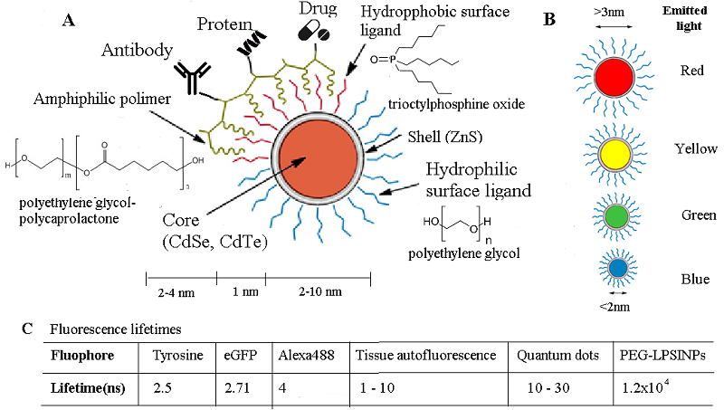 Оболочка КТ состоит из трех частей: гидрофобной, наночастиц, и дополнительной гидрофильной, обеспечивающей ее растворимость в воде и биодоступность для взаимодействия с биологичеки (физиологически) активными соединениями (рисунок 2). Для повышения степени растворимости КТ можно использовать, например, полипропиленгликоль или органические кислоты, содержащие тиольную группу [79]. Функционально активные группы могут быть связаны с оболочкой путем электростатического взаимодействия, ковалентного связывания, координационной связи или в результате адсорбции. Тип связи влияет на стабильность частиц и определяет их активность in vivo [80]. От степени деструкции в организме функциональной оболочки квантовых точек во многом зависит потенциальная токсичность синтезированных наночастиц [81]. Так несмотря на ряд преимуществ халькогенидные КТ характеризуются нежелательной токсичностью относительно живых клеток, тканей и организмов [82, 83]. Основная предполагаемая причина этой токсичности связана с выщелачиванием ионов кадмия из ядра. Поэтому для уменьшения токсичности было разработано новое поколение КТ, не содержащих кадмий, таких как кремниевые КТ (Si-КТ), КТ ближнего инфракрасного диапазона (КТ Ag2Se, КТ Ag2Sh, КТ InP), углеродные точки (C-точки), графеновые КТ (GQD). В эту же группу вошел кластер наночастиц Au/Ag/Cu, не содержащих кадмий [84]. По спектроскопическим свойствам КТ превосходят традиционные органические флуорофоры, отличаются фотохимической стабильностью, в 10–50 раз большими коэффициентами экстинкции, более длительным сроком службы, чем у люминесцентных красителей, сравнительно более узкими полосами излучения и в 10–20 раз более яркой люминесценцией [85-87]. Это позволяет проводить мультиплексную биовизуализацию с одним источником. Высокая фотостабильность полупроводниковых нанокристаллов в 100-4000 раз превышает фотостабильность лучших органических флуорофоров [88-90], что позволяет отслеживать отдельные вирусы в течение нескольких часов с высоким временным разрешением [85]. Mеханизм внутриклеточной доставки определяется комбинацией параметров, включая размер и поверхностный заряд наноносителя. Поскольку плазматическая мембрана заряжена отрицательно, считается, что положительно заряженные молекулы, иммобилизованные на поверхности КТ, облегчают их поглощение клетками в результате электростатического взаимодействия с мембраной. Bысокие коэффициенты экстинкции KT увеличивают яркость всей системы FRET и тем самым облегчают обнаружение аналитов с применением FRET при очень низких концентрациях и вплоть до уровня отдельных молекул [85]. Пептид RGD (аргинин-глицин-аспарагиновая кислота) специфически нацелен на интегрин αvβ3, который сверхэкспрессируется во многих типах опухолей во время ангиогенеза. Этот пептид конъюгировали с КТ, используемые в качестве NIR-зонда для визуализации опухолей in vivo [87]. Общая структура биовектора была создана путем прикрепления пептида RGD и противоопухолевого препарата доксорубицина (Dox) к поверхности КТ, излучающих в ближнем ИК-диапазоне, для одновременной визуализации и лечения [91]. С открытием квантовых точек появились впечатляющие перспективы развития генетики и молекулярной биологии, медицины и экологии. Наибольшее практическое применение получили наиболее легко синтезируемые «сферические» КТ. В био
