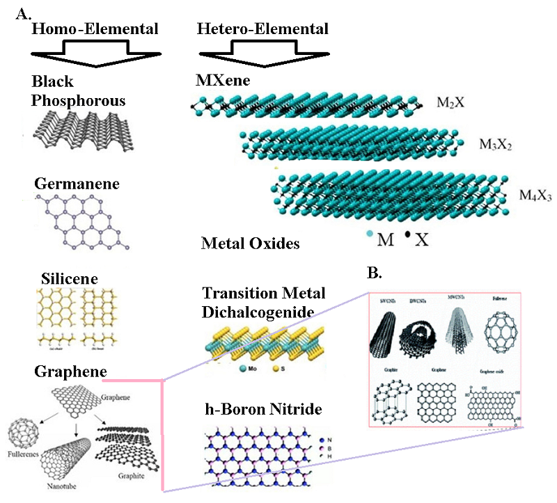 2D-материалы представляют собой однослойные или многослойные материалы, состоящие из одного или нескольких элементов толщиной в несколько нанометров. Их уникальные, настраиваемые физические и химические свойства, включая простоту химической функционализации, делают этот класс материалов полезным в различных технологических приложениях. Возможность использования 2D-материалов в значительной степени зависит от новых синтетических подходов, способствующих улучшению свойств, повышению производительности, долговечности и снижению затрат при производстве. Так при синтезе 2D-наноматериалов широко применяются гидротермальные процессы через путь синтеза прекурсора-продукта. Этот метод включает в себя системы периодического или непрерывного потока. Оба метода дают частицы с различной морфологией, размером и площадью поверхности из-за различных механизмов образования частиц. Периодический и непрерывный гидротермальный поточный синтез успешно применялся при получении ряда двумерных производных (графена, MXene и дисульфида молибдена), включая их химическую функционализацию, как выгодный подход к исследованию свойств этих материалов и перспективы дальнейших исследований [91]. 2.4. Технология полевых транзисторов на основе углеродных наноматериалов для обнаружения биомаркеров Интенсивное развитие технологии создания полевых транзисторов непосредственно связано с использованием уникальных свойств новых наноматериалов в качестве преобразователей FET. Материалы для датчиков являются одними из наиболее важных компонентов, которые необходимо учитывать при изготовлении биосенсоров на полевых транзисторах. Среди наиболее привлекательных наноматериалов, вызывающих особый интерес, являются наноматериалы на основе кремния (кремниевые нанопроволоки - SiNW), дихалькогенидов переходных металлов [92, 93] и углеродные (двумерные материалы, такие как графен, графеновые наноленты, окись графена, углеродные нанотрубки, включая многослойные углеродные нанотрубки (MWCNT) и однослойные углеродные нанотрубки (SWCNT), МОК, интеграция которых в структуру сенсорных каналов значительно улучшает характеристики биосенсорных устройств типа FET (рис. 4) [94-102]. Принцип действия биосенсоров на основе полевых транзисторов основан на изменении проводимости канала полевого транзистора, который формируется в полупроводниковой нанопроволоке (NW), путем изменения плотности свободных носителей заряда, вызванного модуляцией потенциала на поверхности сенсорного элемента при его взаимодействии с аналитом. Типичный датчик на основе полевого транзистора состоит из полупроводникового канала (SiNW p/n-типа) и трех электродов исток (S), сток (D) и электрод затвора (G). Oбласть между стоком и истоком функционирует как элемент биологического распознавания, который взаимодействует с целевым аналитом/биомолекулами и определяет их концентрацию и электрическую активность. SiNW-FET состоит из одного SiNW (или пучка SiNW), который подключен между электродом истока (S) и стока (D), уложенным на пластину Si. Электроды истока и стока взаимодействуют друг с другом через полупроводниковый канал, в то время как электрод затвора модулирует проводимость канала через приложенный электрический потенциал. Молекулы рецептора, иммобилизованные на SiNW (s), используются для распознавания конкретны