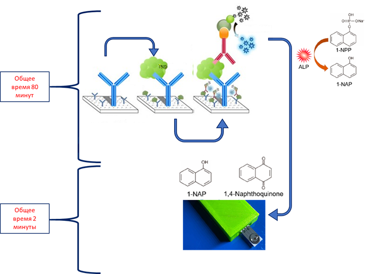 Таким образом, обработка ПГЭ электродов серной кислотой способствует снижению предела обнаружения (LOD) по 1–нафтолу с 68 мкМ до 0.73 мкМ в режиме ДИВА, и с 2.70 мкМ до 0.09 мкМ в режиме ХА относительно электродов, обработанных в 10 mM PBS. Электрохимический иммуноферментный анализ с оптимальным субстратом рЩФ и обработкой поверхности ПГЭ в формате «сэндвич» анализа на прокальцитонин. Для проведения ИФА с электрохимической детекцией были использованы захватывающие моноклональные антитела к прокальцитонину, сорбированные на магнитные наночастицы и детектирующие поликлональные антитела, меченные ЩФ. Иммунная реакция связывания антигена с антителом проходила в плашках вне зоны ПГЭ. Процесс занимал 80 мин и подробно описан в разделе «Методика». После проведения ферментативной реакции в присутствии субстрата (1-NPP), отбирали 80 мкл продукта ферментативной реакции (1-нафтола), наносили пробу на ПГЭ и проводили измерение в режиме ДИВА (рис. 10).