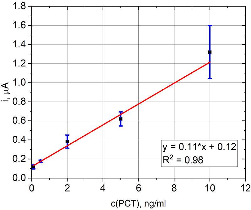 Разработанный иммуносенсор с электрохимической детекцией был опробован на образцах ПКТ. На рисунке 11 представлена зависимость тока от концентрации прокальцитонина (ПКТ) в модельных буферных растворах (PBS).