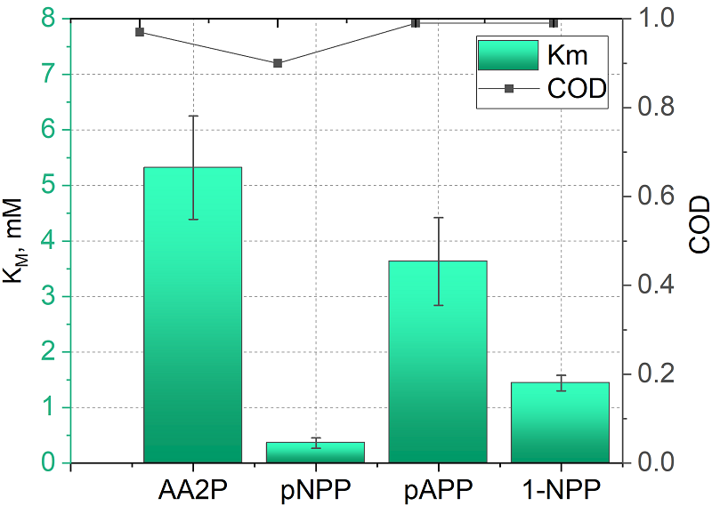 Характеристики субстратов при аппроксимации данных уравнением 1 представлены на рисунке 2. Таким образом, наибольшим значением кажущейся Km обладает субстрат 2-фосфо-L-аскорбиновая кислота (AA2P), что в рамках теории соответствует наихудшему связыванию субстрата с ферментом ЩФ. Коэффициент детерминации (COD, R2) во всех случаях составил не менее 0.9.