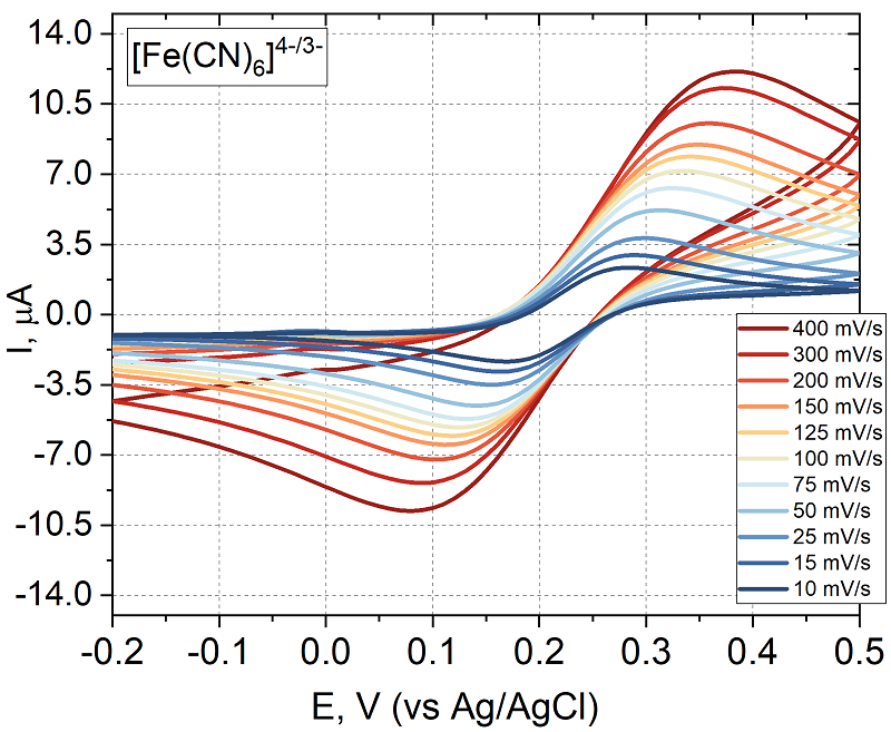 Таким образом, 1-NPP является оптимальным субстратом для электрохимического определения активности рЩФ благодаря высокой скорости ферментативной реакции и низкому потенциалу окисления нафтола. Полученные данные подтверждают возможность интеграции 1-NPP в формат иммуносенсоров для лабораторной диагностики. Достижение более низкого предела обнаружения продукта ферментативной реакции за счет простой предобработки электрода Экспериментальный анализ условий пробоподготовки стабильных электродов с хорошими электроаналитическими характеристиками. Параметры электрохимической реакции. В предыдущем разделе был подобран оптимальный для ЩФ на основе электрохимических характеристик, полученных при электроокислении продукта ферментативной реакции на электроде. При разработке электрохимического ферментного иммуносенсора важным этапом является не только подбор оптимального субстрата для фермента, но и достижение оптимальных характеристик поверхности электрода для оптимизации отклика при окислении продукта. Для подбора субстрата использовали обработку ПГЭ в PBS в течение 10 мин. Чтобы добиться лучшего отклика относительно 1-нафтола (продукта ферментативной реакции 1-нафтил фосфата, 1-NPP) и снижения предела обнаружения применили обработку электрода серной кислотой. Для сравнения влияния различных предобработок использовали методы ДИВА и ХА [31]. В электрохимии оценка константы скорости переноса электронов k0 представляет первостепенный интерес при изучении характеристик электродных материалов. Константа скорости даёт представление о скорости переноса электронов между электроактивным веществом и поверхностью электрода, и о том, определяет ли материал электрода общую скорость электрохимической реакции [32]. Самым широко используемым методом определения k0 является циклическая вольтамперометрия [19, 32]. На рисунке 3 приведена ЦВА для ПГЭ до обработки в эквимолярном растворе ферри/ферроцианида калия в качестве внешнего электролита при разных скоростях сканирования.