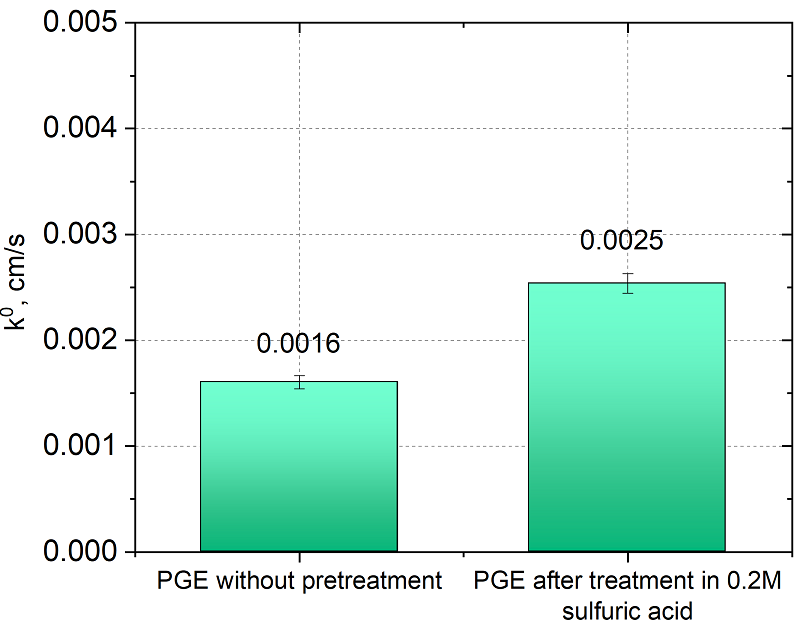 На рисунке 4 представлено сравнение констант гетерогенного переноса электрона для ПГЭ без предобработки и после обработки серной кислотой. Константа скорости переноса электрона после обработки серной кислотой увеличивается. При обработке в PBS реакция переставала иметь квазиобратимый характер и расстояние между пиками не изменялось с изменением скорости сканирования.