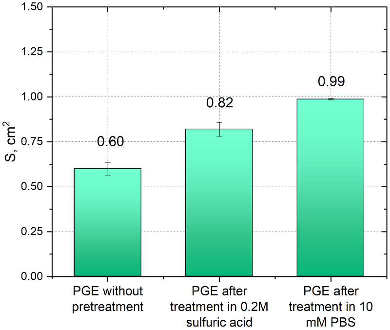 Площадь электроактивной поверхности электрода находили из данных ЦВА при разных скоростях развертки по уравнению Рейнольдса-Шевчика при 25°С [27]. На рисунке 5 представлено сравнение электроактивных площадей до и после обработки электродов в PBS и в серной кислоте.