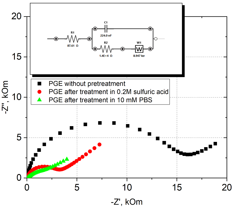 Наибольший вклад в улучшение характеристик электрохимического процесса с участием редокс пары Fe(CN)64-/3- дает обработка фосфатным буферным раствором в режиме ХА. Поскольку данные ЦВА при разных скоростях развертки потенциала не дали возможности для расчета k0 по методу Никольсона для ПГЭ, обработанных в PBS, так как процесс стал преимущественно обратимым (разница между пиками от 10 до 400 мВ/с не менялась и составила 90.7 мВ), для вычисления константы гетерогенного переноса были использованы данные спектроскопии электрохимического импеданса (EIS). Из рисунка 6 видно снижение сопротивления переноса электрону при использовании предобработок в серной кислоте и PBS. На вставке представлена эквивалентная схема химической реакции для аппроксимации и расчета значений элементов, входящих в ее состав (схема соответствует классической цепи Рэндлса [32], ошибка при моделировании процесса химической реакции, аппроксимирующей схемой для элемента, отвечающего сопротивлению переноса электрона, не превышала 1.8 %).
