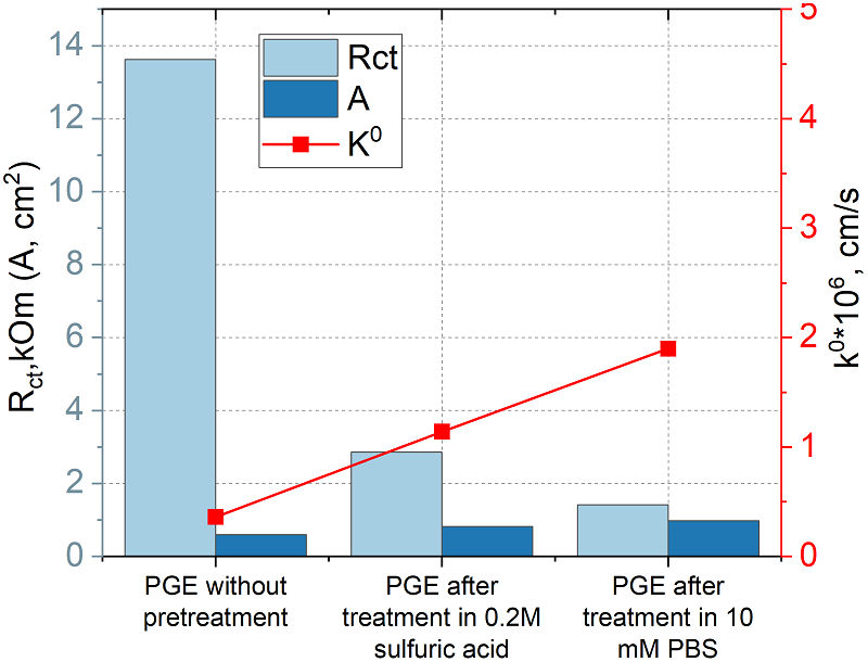 При расчете константы гетерогенного переноса использовали среднее значение электроактивной площади поверхности, полученной по данным ЦВА. На рисунке 7 представлено соотношение изменения основных электрохимических параметров при предварительной обработке электрода. Наблюдается закономерное снижение Rct и увеличение A и k0 при обработке в кислоте и PBS.