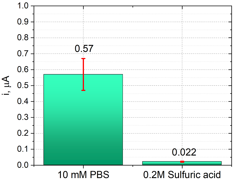 Обработка как кислотой, так и PBS значительно снижает сопротивление переносу электрона, за счет чего константа гетерогенного переноса возрастает в 10 раз по сравнению с исходной поверхностью. Сравнение предобработок ПГЭ при прямом окислении продукта ферментативной реакции (1-нафтола). На рисунке 8 приведены значения токов, регистрируемые в диэтаноламиновом электролите (фоновые токи DEA), на ПГЭ после различной предобработки. Из рисунка 8 видно, что обработка в серной кислоте значительно снижает фоновые токи (в 25 раз относительно обработки в PBS), также стандартное отклонение фоновых токов снижается с ±0.1 мкА до ±0.003 мкА.