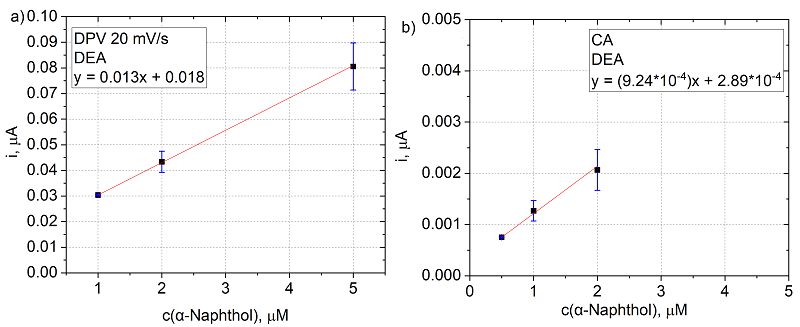 За счет снижения фонового тока удалось добиться лучшего предела обнаружения относительно нафтола. Для ПГЭ, обработанных в серной кислоте, так же, как и для ПГЭ с предобработкой в PBS, были зарегистрированы токи прямого окисления нафтола на электроде в режимах ДИВА и ХА. На рисунке 9 представлены соответствующие концентрационные зависимости тока электроокисления нафтола.