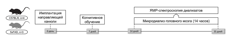 МЕТАБОЛИЧЕСКОЕ ПРОФИЛИРОВАНИЕ ИНТЕРСТИЦИАЛЬНОЙ ЖИДКОСТИ ГИППОКАМПА МЫШЕЙ ЛИНИИ 5XFAD ПОСЛЕ КОГНИТИВНОЙ НАГРУЗКИ: ПИЛОТНОЕ ИССЛЕДОВАНИЕ 1Российский центр неврологии и нейронаук, 125367, Москва, Волоколамское шоссе, 80; *e-mail: yuliakomleva@mail.ru Ключевые слова: болезнь Альцгеймера; гиппокамп; микродиализ; ЯМР-спектроскопия; метаболизм; кетоновые тела DOI: 10.18097/BMCRM00291 ВВЕДЕНИЕ Болезнь Альцгеймера (БА) является наиболее распространённой формой деменции и ведущей причиной возрастной когнитивной дисфункции во всём мире, охватывая до 70% всех случаев деменции [1]. Патологическое снижение когнитивных функций при БА развивается медленно, но прогрессирующе и необратимо, приводя к когнитивной дисфункции, нарушению памяти и поведенческим изменения. Несмотря на интенсивные исследования, патогенез заболевания остаётся не до конца изученным. По имеющимся данным, около 70% факторов риска БА связаны с генетическими и метаболическими нарушениями, включая ожирение, сахарный диабет и гипертонию [2, 3]. Современные представления о патофизиологии БА выходят за рамки традиционной амилоидной гипотезы и включают в себя нарушение энергетического метаболизма головного мозга, особенно в гиппокампе – структуре, которая критически вовлечена в процессы памяти и обучения [4]. На ранних доклинических стадиях заболевания наблюдаются митохондриальная дисфункция, снижение активности ферментов окислительного фосфорилирования, переключение на анаэробный гликолиз и активация глиальных клеток [5–9]. Снижение метаболизма глюкозы является одним из ранних и наиболее устойчивых биомаркеров БА, наблюдающимся задолго до клинической манифестации заболевания [10]. Гипометаболизм глюкозы нарушает работу как гликолиза, так и цикла трикарбоновых кислот, что приводит к снижению уровня пирувата и цитрата [10]. В условиях энергетического дефицита мозг активирует альтернативные пути метаболизма, включая использование кетоновых тел (ацетона, ацетоацетата, β-гидроксибутирата) для поддержания функции нейронов. Такая адаптация рассматривается как компенсаторный механизм, направленный на поддержание энергетического гомеостаза в условиях метаболического стресса [11–13]. Несмотря на наличие обширных данных о нарушении обмена глюкозы, например, вследствие развития инсулинорезистентности при БА, роль альтернативных энергетических субстратов (включая кетоны и короткоцепочечные жирные кислоты), а также их влияние на когнитивные функции, в основном изучали в клеточных и животных моделях или в рамках вмешательств, таких как кетогенная диета [14]. В клинических обсервационных исследованиях повышенный уровень пирувата в спинномозговой жидкости был зафиксирован у пациентов с БА и сосудистой деменцией [15, 16], тогда как снижение концентрации цитрата и сукцината в плазме ассоциировалось с ускоренным когнитивным снижением [17]. Предыдущие исследования на трансгенных моделях БА, включая мышей линии 5xFAD, продемонстрировали ранние нарушения в энергетическом метаболизме головного мозга задолго до появления когнитивных симптомов [18]. Однако большинство работ ограничивались анализом в состоянии покоя и не учитывали влияние когнитивной нагрузки, которая может дополнительно усиливать метаболические расстройства за счёт увеличенного спроса на энергию в нейронах и глии в активных регионах мозг