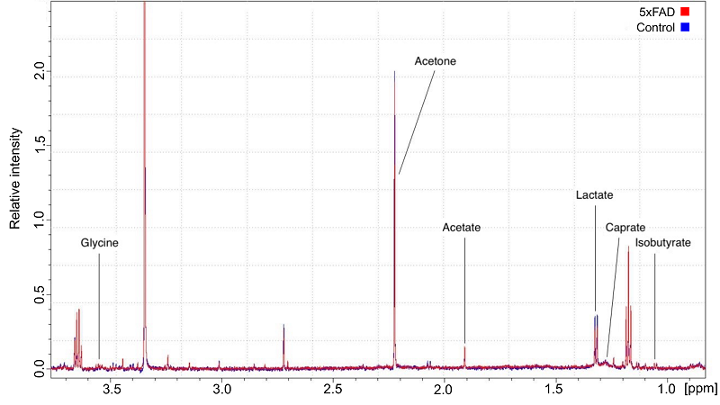 РЕЗУЛЬТАТЫ Посредством ЯМР-спектроскопии количественно были определены профили концентраций метаболитов, включая глицин, ацетон, ацетат, лактат, капрат и изобутират, в интерстициальной жидкости гиппокампа мышей линий C57BL/6 и 5xFAD на 7 и 28 сутки после когнитивного обучения (рис. 2).
