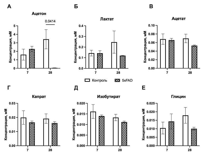 Среднецепочечные жирные кислоты, в том числе капроновая кислота, поступают в организм с пищей и синтезируются кишечной микробиотой, легко проникают через гематоэнцефалический барьер и метаболизируются в митохондриях до ацетил-КоА [24]. У мышей линии 5xFAD уровень производной капроновой кислоты был ниже по сравнению с контрольной группой (рис. 3Г). Хотя эти различия не достигли статистической значимости, они согласуются с гипотезой о нарушении липидного обмена при болезни Альцгеймера [25] и снижении доступности среднецепочечных жирных кислот как дополнительных источников энергии [26]. Учитывая нейропротективные и прокогнитивные свойства среднецепочечных жирных кислот [27], дальнейшее изучение терапевтического потенциала препаратов на основе среднецепочечных жирных кислот для коррекции когнитивного дефицита при болезни Альцгеймера представляет научный интерес. Изобутират, редко изучаемый в контексте нейродегенеративных заболеваний, демонстрировал тенденцию к снижению у мышей линии 5xFAD по сравнению с контрольной группой как на 7, так и на 28 сутки после когнитивного обучения, однако статистическая значимость этих изменений не была достигнута (рис. 3Д). Уровень глицина, выполняющего функции тормозного нейромедиатора и ко-агониста NMDA-рецепторов, также не показал статистически значимой зависимости от факторов «генотип» или «время» (рис. 3Е). В совокупности полученные данные указывают, что у мышей с генетической моделью БА (линия 5xFAD) в отсроченном периоде после когнитивной нагрузки, когда у них проявляются признаки когнитивного дефицита, формируется специфический метаболический профиль, потенциально характеризующийся ограниченной способностью трансгенных животных поддерживать кетоновый метаболизм. Наиболее отчётливо эти изменения у животных с моделью БА по сравнению с животными контрольной группы проявляются к 28 суткам, что может свидетельствовать о нарушении метаболической «поддержки» таких процессов, как нейрогенез и неоангиогенез. ОБСУЖДЕНИЕ В настоящем исследовании с применением методов in vivo микродиализа и ЯМР-спектроскопии была проведена оценка метаболического ответа гиппокампа на когнитивную нагрузку у трансгенных мышей линии 5xFAD и животных дикого типа. Основное внимание было уделено динамике концентраций энергетически значимых и глиально-ассоциированных метаболитов (включая лактат, ацетат, изобутират, ацетон, капрат и глицин). Среди изученных соединений статистически достоверные различия между группами наблюдались только по ацетону, однако выявленные изменения в кетоновом профиле заслуживают отдельного рассмотрения. Поскольку ацетон является кетоновым телом, а кетоновые тела могут служить альтернативным источником энергии для нейронов при сниженной доступности глюкозы [12], снижение концентрации ацетона в мозге у мышей линии 5xFAD в период, характеризующийся показанной нами ранее манифестацией когнитивного дефицита, нарушениями нейрогенеза и гиппокампального ангиогенеза после когнитивной нагрузки [21], может указывать на ограниченную метаболическую пластичность при болезни Альцгеймера. Этот эффект может быть связан как с нарушением β-окисления жирных кислот, так и с митохондриальной дисфункцией, которые характерны для патогенеза БА [28]. Следует отметить, что концентрация ацетона превосходил