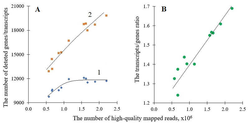 CONCLUSIONS In MinION-based nanopore sequencing, the yield of detected genes and transcripts substantially depends on the sequencing depth presented as the sequencing output in high-quality mapped reads. While practically all of actively transcribed genes appear to be detected when the reads output exceeds 1.2 million, the number of revealed transcripts steadily increased over the studied range of reads output. The yield of more than 2.3 million high-quality mapped reads would be required in the MinION-based nanopore sequencing in order to approach the level of 1.8 transcripts (splice variants) per gene, expected from the known numbers of annotated genes and transcripts for human genome. The sequencing data used have been produced for human liver tissue and hepatocyte-derived cells and it is still to be seen whether the made conclusions can be generalized to other types of cells and tissues. COMPLIANCE WITH ETHICAL STANDARDS The collection of human liver tissue samples was approved by the Ethical Committee of the N.I. Pirogov Russian State Medical University (Protocol #3; March 15, 2018). FUNDING This work was financed by the Ministry of Science and Higher Education of the Russian Federation within the framework of Agreement No. 075-15-2024-643. CONFLICT OF INTEREST The authors declare no conflict of interest. REFERENCES