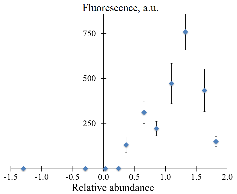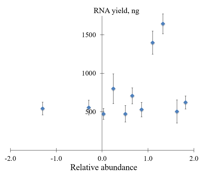 Figure 5 demonstrates the yield of target amplicons as a function of the relative abundance. Clearly, their yield in NASBA is markedly influenced by a sequence of the 5-nucleotide insert at positions +4 to +8. The primer P1_68 characterized by the relative abundance value of 1.33 showed the best result (Fig. 5). There is a strong increase in the yield of target amplicons for variants of P1 primers with inserts characterized by relative abundance values between 0.25 and 1.33. However, for two variants of P1 primer with higher relative abundance values, P1_1 and P1_4, the obvious decline in the yield of target amplicons was observed (Fig. 5).
