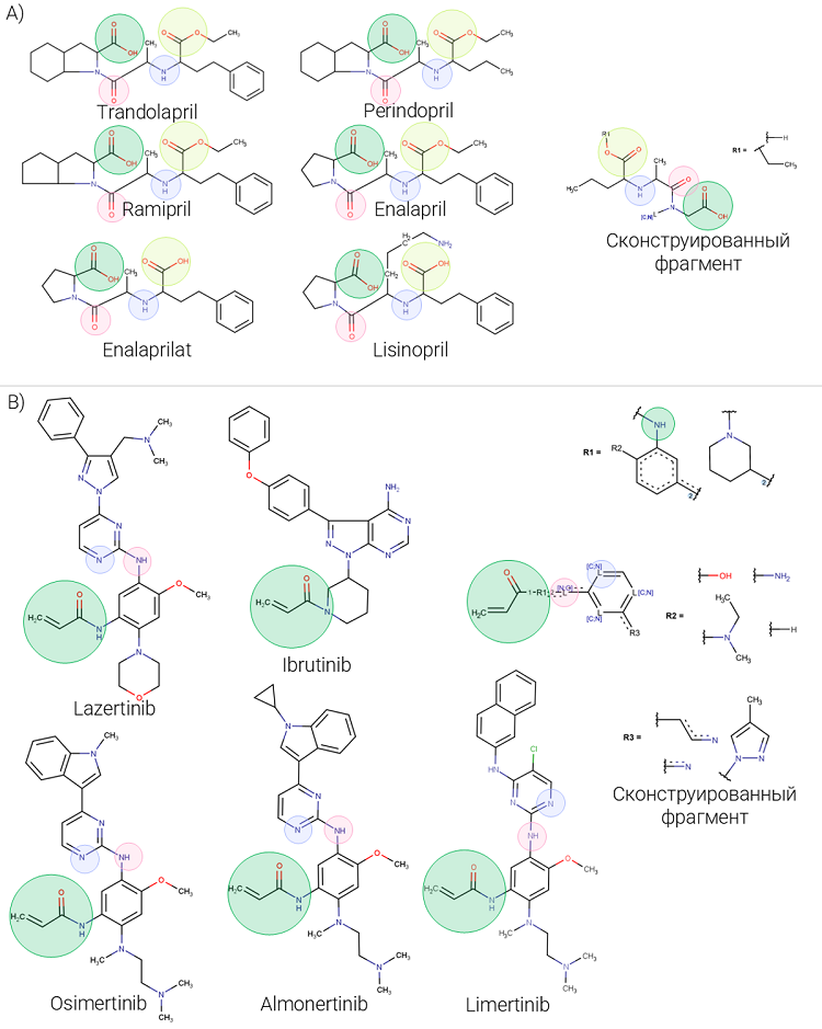 Важно упомянуть, что перечисленные НЛР могут возникать вследствие взаимодействия не только с выбранными биомакромолекулами. Множество других рецепторов и ферментов были определены в качестве потенциальных звеньев патогенеза этих НЛР с разной степенью достоверности [3]. Для каждой из этих мишеней в WWAD представлены взаимодействующие с ними АФС, что позволило с использованием PASS Professional на основе БД WWAD создать SAR Base, обеспечивающую прогноз описанных выше пяти механизмов действия с инвариантной точностью прогноза 0.9 и выше (табл. 1). Используя эту базу знаний, нами был выполнен прогноз для 5 наборов соединений, в каждом из которых присутствовали только АФС с требуемым видом активности. В результате мы получили изображения структурных формул веществ, на которых атомы были окрашены на основе их вклада в прогнозируемую активность с использованием цветовой схемы PASS (см. рис. 1Б). Пример таких изображений для ингибиторов АПФ представлен на рисунке 2А, для соединений из остальных групп – в Дополнительных материалах на рисунках S1-S4. Используя окрашенные в зеленый цвет участки структурных формул, мы построили структуры Маркуша, которые описывают важные для проявления активности участки структуры соединений.