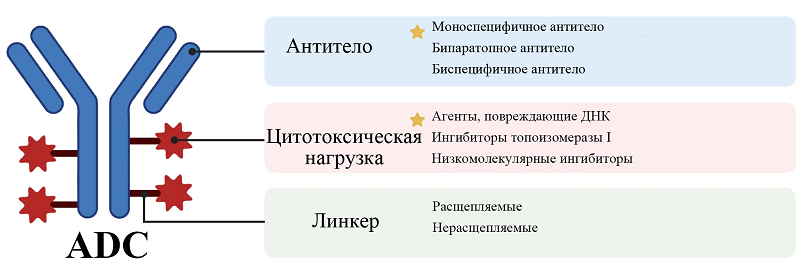 1.3. Выбор линкерной последовательности как важная часть оптимизации препарата На разнообразные свойства ADC, включая специфичность, стабильность, эффективность и токсичность, влияют также свойства линкера [36]. Используемые на сегодняшний день типы линкеров представлены в таблице 2. Расщепляемые линкеры либо химически лабильны (гидразоновая группа и дисульфидный «мостик»), либо ферментативно лабильны. Гидролиз гидразоновой связи в линкере происходит преимущественно в лизосомах и эндосомах при интернализации, с периодическим гидролизом в плазме, что приводит к нецелевой системной токсичности [37]. Дисульфидный тип линкера может быть стабильным в плазме, специфически высвобождая активный «полезный груз» в раковых клетках с повышенным уровнем восстановленного глутатиона [37]. Чувствительные к ферментам линкеры имеют сродство к лизосомальной протеазе, которая обычно сверхэкспрессируется в раковых клетках, что обеспечивает точное высвобождение лекарственного средства в клетках после интернализации [38]. ADC с нерасщепляемыми линкерами устойчивы к химическому или ферментативному расщеплению в плазме и требуют полной деградации антитела в поздних эндосомах и лизосомах для высвобождения полезной нагрузки. Следовательно, ADC с нерасщепляемыми линкерами могут иметь наименьшую нецелевую системную токсичность из-за повышенной стабильности в плазме, становясь наиболее подходящими для лечения опухолей с гомогенной экспрессией антигена [39]. Некоторые из ADC были разработаны так, чтобы оказывать желаемый «нецелевой эффект» для «убийства сторонних наблюдателей», распространяя цитотоксический эффект на клетки с низкой или отрицательной экспрессией антигена в непосредственной близости от опухоли. Для работы этого механизма решающее значение имеют несколько характеристик молекул ADC, а именно: расщепляемый линкер и неполярная, свободно проникающая через мембрану полезная нагрузка. Например, трастузумаб дерукстекан (T-DXd) имеет расщепляемый ферментативный линкер, в отличие от трастузумаба эмтанзина, который имеет тиоэфирный нерасщепляемый линкер. Полезные нагрузки, такие как дерукстекан, MMAE или майтансиноид DM4, проникают сквозь клеточные мембраны и могут диффундировать из клеток после расщепления в лизосомах. Следовательно, в силу свойств своего компонента T-DXd обладает «эффектом свидетеля» и, таким образом, эффективен даже при опухолях с низкой экспрессией HER2, тогда как трастузумаб эмтанзин, благодаря своим свойствам, имеет более низкий профиль токсичности [40]. Напротив, чтобы уменьшить нежелательную системную токсичность молекул полезной нагрузки, проникающих из опухолевых клеток, можно использовать ионизируемые полезные нагрузки (например, содержащие карбоновые кислоты). На данный момент трастузумаб эмтанзин является единственным одобренным ADC, в котором используется нерасщепляемый линкер, тогда как остальные ADC оснащены расщепляемыми линкерами. Сейчас активно идет модификация и разработка новых линкерных связей.