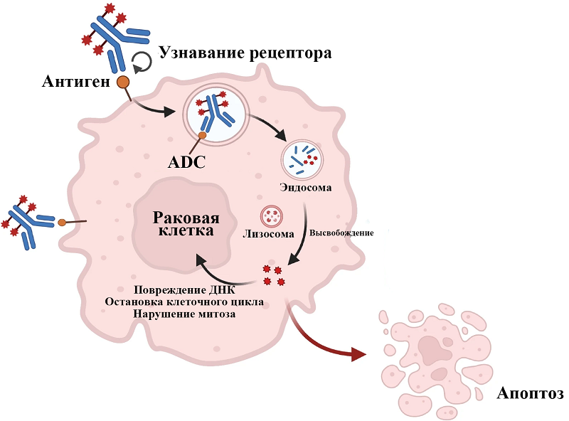 1.1. Механизм действия Конъюгаты ADC (антитело-лекарственное средство) состоят из антитела, цитотоксической нагрузки и химического линкера [25]. Как только ADC достигает клеток-мишеней, моноклональное антитело (mAb) распознает антигены клеточной поверхности и связывается с ними. Комплекс ADC-антиген затем интернализуется внутрь раковой клетки путем эндоцитоза с образованием ранней эндосомы, которая после созревания образует поздние эндосомы и, наконец, сливается с лизосомами. Цитотоксическое лекарственное средство затем высвобождается из конъюгата с моноклональным антителом посредством химической реакции или ферментативного расщепления в лизосомах и оказывает цитотоксический эффект, вызывая апоптоз или гибель клеток (рис. 2) [26].