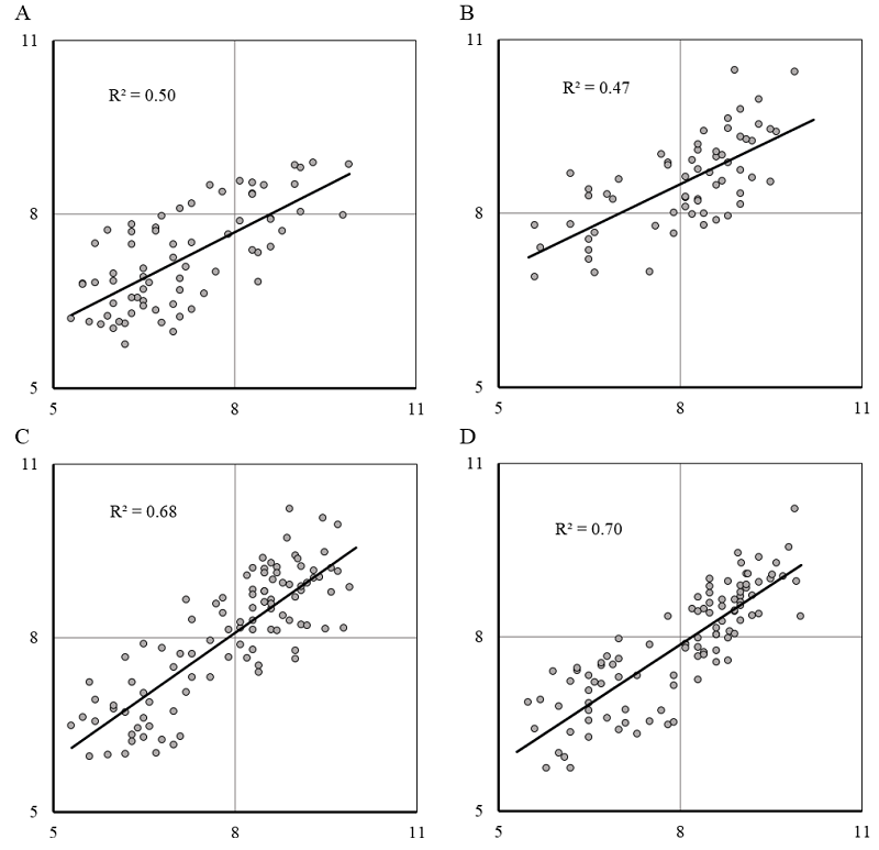 Figure 2. The comparison of observed and predicted pKi values in testing procedure. A. The prediction for set M2 by the equation obtained for set M1, M3, M4, M5. B. The prediction for set M3 by the equation obtained for set M1, M2, M3, M5. C. The prediction for even half of the set M1, M2, M3, M4, M5 by the equation obtained for odd part. D. The prediction for odd half of the set M1, M2, M3, M4, M5 by the equation obtained for even part.