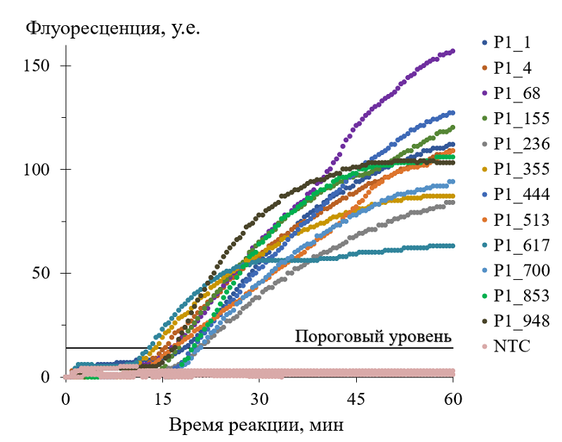 Варианты праймера Р1, использованные в работе. Коровая последовательность промотора Т7 выделена синим шрифтом. Последовательность нуклеотидной вставки, влияющей на эффективность праймера в NASBA, выделена красным.