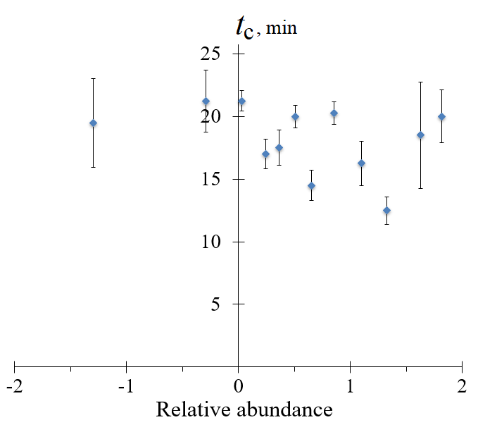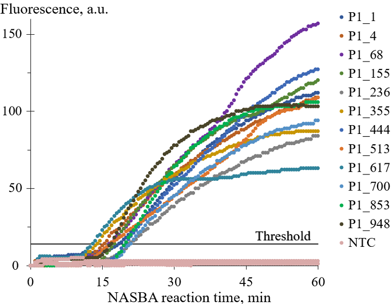 1.3. Gel electrophoresis and RNA yield quantification RNA amplicons generated by NASBA were subjected to electrophoresis under denaturing conditions in 12% (20 M of formamide) polyacrylamide gel in TBE buffer (89 mM tris(hydroxymethyl)aminomethane, 89 mM boric acid, 2 mM ethylenediaminetetraacetic acid, pH 8.3), using a Mini-PROTEAN Tetra Cell electrophoresis system (“Bio-Rad”, USA). An aliquot of each completed NASBA reaction was diluted twenty-fold with 75% formamide solution and 1 µl of the dilution was loaded into a gel well. Electrophoresis was carried out for 80 min with a voltage of 30 V per cm of gel. The gels were scanned on a Typhoon FLA 9500 Gel Imager (“GE Healthcare”, USA) after staining with 1× solution of SYBR Gold fluorescent dye in TBE buffer (“Thermo Fisher Scientific”). The GeneRuler Ultra Low Range DNA Ladder (“Thermo Fisher Scientific”) was used as a size standard. The fluorescence of RNA amplicons in each electrophoretic band was quantified as an area under the corresponding fluorescence peak (in arbitrary units), using the automated image analysis software ImageQuant TL (“Cytiva”, USA). To quantify the overall RNA yield in NASBA reaction in mass units, the RNA concentration in a completed NASBA reaction was determined on a Qubit 4.0 fluorimeter with the Qubit RNA BR Assay Kit. 1.4. Statistical treatment The arithmetic means and the corresponding standard deviations were calculated using statistical functions of the Microsoft Excell software. The calculations were based on results of 3 to 5 independent experiments. METHODS Fig. 1 shows representative amplification curves obtained with the P1 primer variants listed in Table 1. For ease of comparison, NASBA kinetics was described by characteristic amplification time tc which was calculated based on Cp values provided by the thermal cycler software (in the number of cycles) and the known cycle duration (time period between consecutive measurements of fluorescence intensity). In Figure 2, tc values for P1 primer variants were plotted as a function of “relative abundance” (Table 1). The relative abundance is a characteristic of each P1 primer used and was taken from the work by Conrad et al. [25]. It is a decimal logarithm of a ration of the number of RNA molecules synthesized on a DNA template with a particular 5-nucleotide insert (positions +4 to +8) to the number of copies of this DNA template. In fact, the relative abundance value shows how effectively a given DNA template was transcribed into RNA in the course of in vitro transcription. As seen from Figures 1 and 2, there is no clear dependence of NASBA kinetics on the values of relative abundance, and, subsequently, the sequence of the insert.