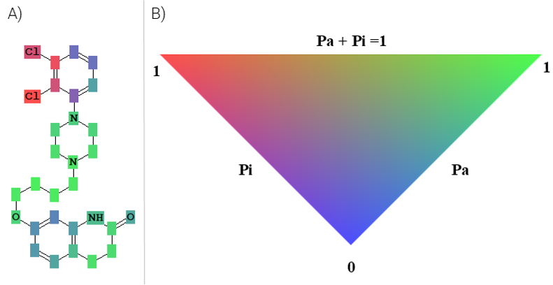 Важно упомянуть, что перечисленные НЛР могут возникать вследствие взаимодействия не только с выбранными биомакромолекулами. Множество других рецепторов и ферментов были определены в качестве потенциальных звеньев патогенеза этих НЛР с разной степенью достоверности [3]. Для каждой из этих мишеней в WWAD представлены взаимодействующие с ними АФС, что позволило с использованием PASS Professional на основе БД WWAD создать SAR Base, обеспечивающую прогноз описанных выше пяти механизмов действия с инвариантной точностью прогноза 0.9 и выше (табл. 1). Используя эту базу знаний, нами был выполнен прогноз для 5 наборов соединений, в каждом из которых присутствовали только АФС с требуемым видом активности. В результате мы получили изображения структурных формул веществ, на которых атомы были окрашены на основе их вклада в прогнозируемую активность с использованием цветовой схемы PASS (см. рис. 1Б). Пример таких изображений для ингибиторов АПФ представлен на рисунке 2А, для соединений из остальных групп – в Дополнительных материалах на рисунках S1-S4. Используя окрашенные в зеленый цвет участки структурных формул, мы построили структуры Маркуша, которые описывают важные для проявления активности участки структуры соединений.