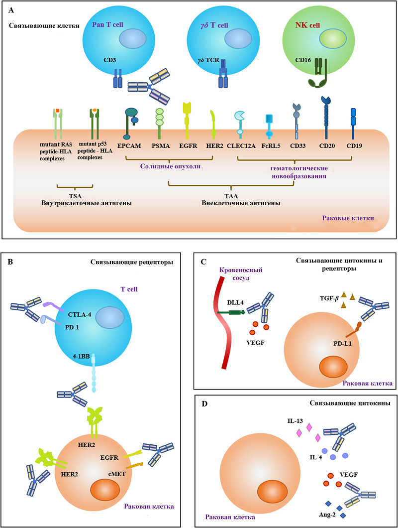 2.2. Основные мишени и терапевтические применения в онкологии К мишеням, на которые нацелены одобрнные для использования bsAb, работающие по принципу клеточных мостиков, относятся CD19, EpCAM, CD20, gp100 и BCMA. Среди bsAb, работающих по принципу клеточных мостиков и проходящих клинические испытания, мишенями являются CD33, CD37, CD38, CD123, FLT-3 и CLEC12A для гематологических злокачественных новообразований, а также HER2, CEA, PMEL, PSMA, GPA33, GPC3 и B7H3 для солидных опухолей [52]. NK-клетки также могут выступать в качестве эффекторных клеток, рекрутируемых bsAb, работающими по принципу клеточных мостиков. CD16 на NK-клетках часто используется в качестве мишени для этой категории bsAb. Например, bsAb, нацеленные на CD30×CD16, в настоящее время оцениваются в клинических испытаниях для терапии гематологических злокачественных новообразований [53]. Активно изучаются bsAb, которые могут блокировать два взаимно связанных сигнальных пути посредством нацеливания на два эпитопа на опухолевые клетки или на опухолевое микроокружение. Пары антигенов включают VEGF×Ang-2, EGFR×c-MET, IGF-1×IGF-2, VEGF×DLL4, HER2×HER2 и HER2×HER3. В мае 2021 года FDA одобрило амивантамаб (Рибревант) компании Janssen, нацеленный на EGFR×c-MET, для лечения немелкоклеточного рака легких (НМРЛ) [54]. BsAbs, которые блокируют иммунные контрольные точки, такие как PD-1×LAG3, PD-L1×TIGIT и PD-L1×CTLA-4, представляют собой еще одну категорию препаратов, протестированных в клинических испытаниях. Иммунные контрольные точки оказывают ингибирующее действие на активность иммунных клеток. bsAb, которые одновременно воздействуют на две иммунные контрольные точки, пробуют использовать для лечения солидных опухолей, поскольку они потенциально повышают эффективность ингибирования контрольных точек по сравнению с монотерапией. Кадонилимаб Akeso, блокатор PD-1×CTLA-4, был одобрен в Китае в июне 2022 года для лечения рецидивирующего или метастатического рака шейки матки. Это первый одобренный двойной ингибитор иммунных контрольных точек bsAb. Также были разработаны bsAb иммунных контрольных точек в сочетании с ТАА, такие как PD1×VEGF и PD1×HER2 [55]. BsAbs, которые совместно нацелены на костимулирующие молекулы Т-клеток и иммунные контрольные точки, такие как CTLA-4×OX40 (CD134) и PD-L1×4-1BB (CD137), в настоящее время находятся в стадии разработки [56]. Опыт создания множества успешных bsAb послужил важной основой для разработки новых. Правильный структурный дизайн и выбор мишени имеют решающее значение для обеспечения успеха разработки лекарственных средств, которые сохраняют эффективность комбинированной терапии и пониженную токсичность, что является одним из основных преимуществ биспецифических антител. Систематическое изучение успешных примеров создания биспецифических антител может помочь в разработке новых терапевтических антител. Разработка биспецифических антител открыла новые возможности в создании инновационных лекарств, которые могут воздействовать на несколько метаболических путей с уникальными или перекрывающимися функциями в патогенезе одновременно. Высокая селективность этих антител делает их идеальными для использования в качестве препаратов ADC, которые могут повысить эффективность действия против раковых клеток и увеличить интернализацию для лучшего удаления опухолевых клеток. Кроме того, ожидается, что разработка триспецифичных и тетраспецифичных антител еще больше усилит противоо