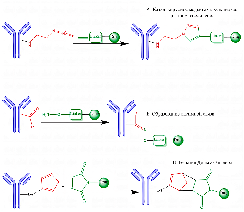4.2. Конъюгация по сульфгидрильным группам цистеина с использованием малеимидов Одним из наиболее распространенных методов, наряду с конъюгацией по остаткам лизина, является стохастическая конъюгация по нативным остаткам цистеина. Этот подход основан на частичном восстановлении четырех межцепочечных дисульфидных связей в молекуле IgG1, что приводит к экспозиции реакционноспособных тиоловых групп (--SH). Эти тиолы вступают в реакцию Михаэля с электрофильными акцепторами, чаще всего с малеимидными производными синтетических цитотоксических агентов (рис. 5А). Варьируя условия восстановления и стехиометрию полезной нагрузки, можно получать ADC с различным и контролируемым коэффициентом конъюгации (DAR), преимущественно равным 2, 4, 6 или 8 [107]. Однако, несмотря на управляемость DAR, этот метод, как и конъюгация по остаткам лизина, порождает гетерогенную популяцию молекул, являющихся региоизомерами из-за присоединения к разным остаткам цистеина. Эта гетерогенность негативно сказывается на терапевтическом индексе, поскольку разные изомеры обладают вариабельными фармакокинетическими профилями, токсичностью и склонностью к агрегации. Более контролируемым вариантом данной технологии является использование инженерных цистеинов. Метод заключается во внесении точечных мутаций для кодирования остатков цистеина в строго заданных позициях антитела, что позволяет направленно присоединять полезную нагрузку. Это обеспечивает не только однородный DAR, но и контроль над ориентацией цитотоксического агента, что было реализовано, например, в препарате лонакатуксимаб тезиринейн (DAR2) [108]. Подобный подход способствует получению более гомогенного и воспроизводимого продукта. Одним из существенных недостатков классической тиол-малеимидной химии является обратимость реакции Михаэля (ретро-реакция Михаэля), скорость которой зависит от положения конъюгации. Это может приводить к преждевременному высвобождению полезной нагрузки in vivo и её неспецифическому переносу на другие тиолсодержащие молекулы, например, на альбумин или глутатион, что усиливает внецелевую токсичность. Для повышения стабильности связи разработаны стратегии, приводящие к гидролизу сукцинимидного кольца с образованием более стабильных и необратимых аддуктов. Логическим развитием стремления к гомогенности стало создание ADC с DAR8 путем конъюгации по всем межцепочечным цистеинам. Однако, несмотря на улучшение in vitro эффективности, такие высоконагруженные конъюгаты демонстрируют сниженную in vivo активность из-за ускоренного клиренса, вызванного повышенной гидрофобностью и нарушением важных структурных дисульфидных связей [108]. Альтернативой стал метод тиолового мостика, при котором бифункциональные конструкции «линкер-полезная нагрузка» используются для сшивания восстановленных межцепочечных цистеинов. Этот подход позволяет получать гомогенные ADC с DAR4, восстанавливая при этом нативную дисульфидную сеть, что повышает стабильность антитела, улучшает фармакокинетику и переносимость in vivo по сравнению с традиционными конъюгатами. Несмотря на эти недостатки, большинство одобренных ADC по-прежнему используют стохастические методы конъюгации. Их ключевые преимущества – простота и скорость производственного процесса, так как они не требуют сложной белковой инженерии