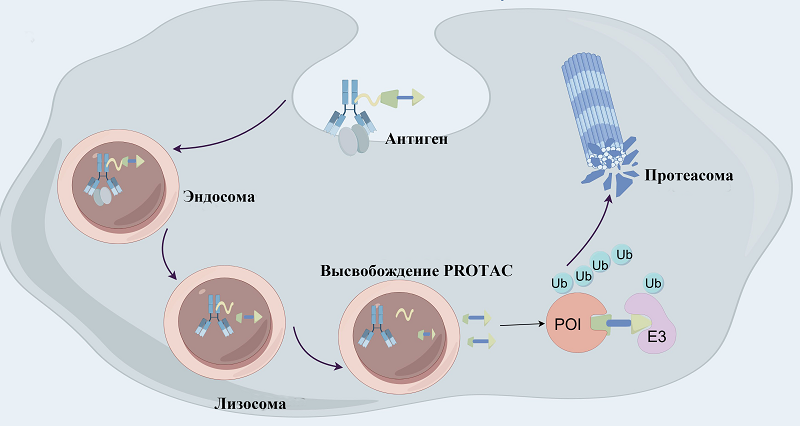 В разработке ADC такие клик-реакции, как CuAAC, образование оксимов и реакция Дильса–Альдера, предлагают универсальные, биоортогональные и эффективные стратегии для стабильной и сайт-специфической биоконъюгации. 5. ПЕРСПЕКТИВНЫЕ ПЛАТФОРМЫ ДЛЯ ТАРГЕТНОЙ ТЕРАПИИ: ОТ ПРОТЕОЛИТИЧЕСКОЙ ДЕГРАДАЦИИ ДО УПРАВЛЯЕМЫХ КОНЪЮГАТОВ Парадигма разработки таргетных противоопухолевых препаратов вышла за рамки простой доставки цитотоксических агентов. Современные исследования сосредоточены на создании принципиально новых платформ, которые действуют на ранее «недосягаемые» мишени и обеспечивают беспрецедентный уровень контроля над терапевтическим воздействием. Эти подходы, многие из которых находятся на переднем крае науки, формируют основу для терапии следующего поколения. 5.1. PROTAC-ADC (Degrader-Antibody Conjugates) Развитие терапий, направленных на деградацию болезнетворных белков, представляет собой одну из самых динамичных областей современной разработки препаратов. Традиционная парадигма, в которой малые молекулы-ингибиторы временно блокируют активность мишени, имеет фундаментальные ограничения. Она плохо применима к обширному классу белков, которые традиционно считаются труднодоступными для таргетной терапии из-за отсутствия чётких активных сайтов, таких как транскрипционные факторы или каркасные белки [122]. Ответом на этот вызов стала технология PROteolysis TArgeting Chimeras (PROTAC), использующая принципиально иную, event-driven фармакологию. PROTAC представляют собой гетеробифункциональные молекулы, состоящие из лиганда к белку-мишени (POI), лиганда к E3 убиквитин-лигазе и соединяющего их линкера [123]. Их каталитический механизм действия заключается в формировании тернарного комплекса POI–PROTAC–E3, что приводит к полиубиквитинизации POI и его последующей деградации 26S протеасомой [124] Этот подход доказал свои ключевые преимущества: возможность воздействовать на белки, которые считаются «нелегируемыми» для традиционных ингибиторов, благодаря каталитическому механизму деградации [125], а также способность преодолевать резистентность, вызванную мутациями мишени (например, BTK C481S [126] или AR [127]), и возможность полностью устранять все функции белка, включая каркасные, что критично для таких мишеней, как рецепторные тирозинкиназы [128]. Однако широкому терапевтическому применению классических PROTAC препятствуют серьезные ограничения. Главным из них является отсутствие тканевой и клеточной селективности, поскольку используемые E3 лигазы (VHL, CRBN и др.) экспрессируются повсеместно [129]. Кроме того, PROTAC часто обладают неоптимальными фармакокинетическими свойствами: высокая молекулярная масса (700–1100 Да) и полярность ведут к низкой пероральной биодоступности и быстрому клиренсу, требуя сложных формуляров для исследований in vivo. Для решения, в первую очередь, проблемы селективности была разработана стратегия конъюгации PROTAC с моноклональными антителами, что привело к созданию нового класса соединений – Degrader-Antibody Conjugates (DAC), также известных как Antibody-PROTAC Conjugates [130]. Эта платформа объединяет преимущества двух технологий: точную таргетную доставку антитела к специфическому поверхностному антигену (например, HER2, CLL1, CD22) и каталитическую эффективность PROTAC. Конъюгат антитело-PROTAC действует по принципу таргетной доставки гетеробифункциональной молекулы, направляющей белок-мишень на 